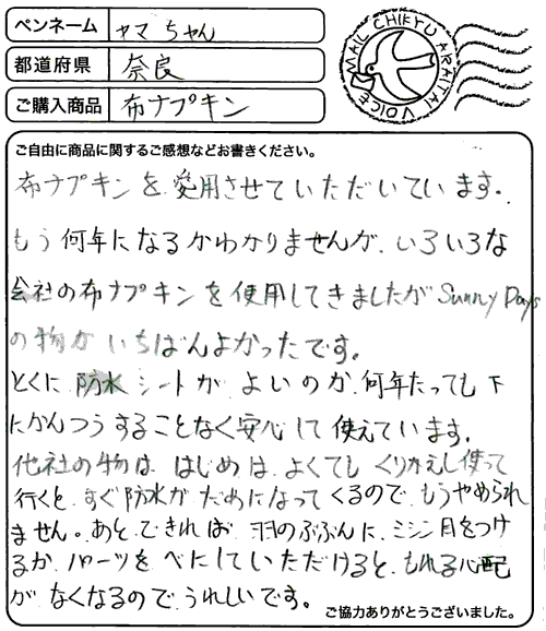 Sunny Days布ナプキン はじめてセットの感想をアップしていただきましたっ。