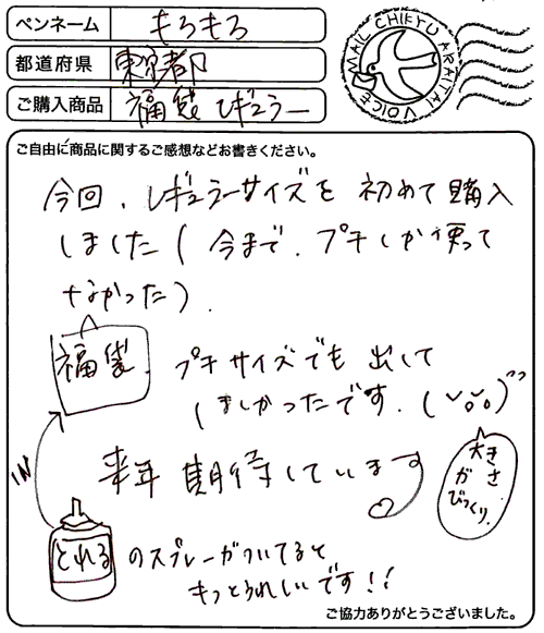 今回、レギュラーサイズを初めて購入しました (今まで、プチしか使ってなかった)。 福袋、プチサイズでも出してほしかったです。 来年期待しています。 福袋にとれるのスプレーがついてるともっとうれしいです!!