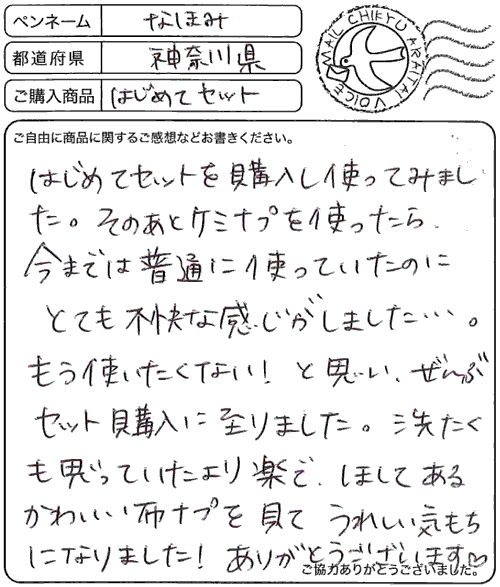 はじめてセットを購入し使ってみました。そのあとケミナプを 使ったら、今までは普通に使っていたのにとても不快な感じが しました・・・。もう使いたくない!と思い、ぜんぶセット購入に 至りました。洗たくも思っていたより楽で、ほしてあるかわいい 布ナプを見てうれしい気もちになりました! ありがとうございます。