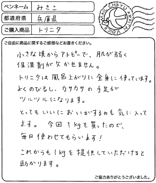 小さな頃からアトピーで、肌が弱く保湿剤が欠かせません。 トリニタは風呂上がりに全身に使っています。 よくのびるし、カサカサの手足がツルツルになります。 とってもいいにおいがするのも気に入ってます。 今回1kgを買ったので、毎日使わせてもらいます! これからも1kgを提供していただけると助かります。