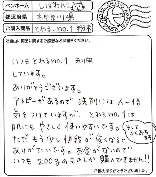 いつもとれるNO.1利用しています。ありがとうございます。 アトピーがあるので洗剤には人一倍気をつけていますが、 とれるNO.1は肌にもやさしく使いやすいです。 そしてよくおちます。ただもう少し値段が安くなると ありがたいです。お金がないのでいつも200gのものしか 購入できません!!