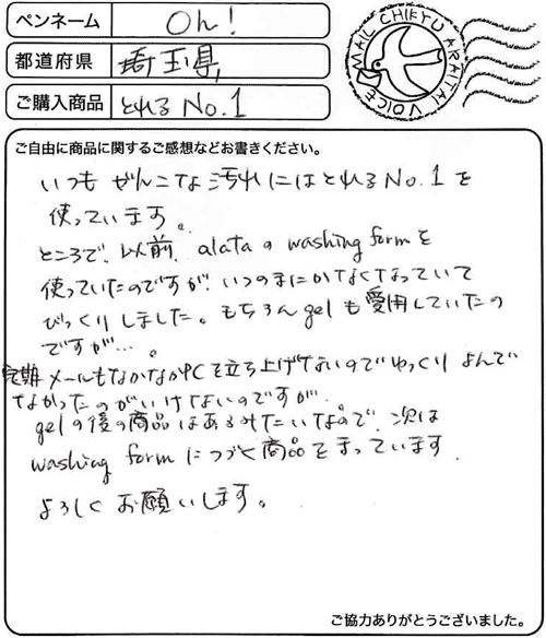いつもがんこな汚れにはとれるNO.1を使っています。 ところで、以前、alataのwashing formを使っていたのですが、 いつのまにかなくなっていてびっくりしました。もちろんgelも 愛用していたのですが・・・。定期メールもなかなかPCを 立ち上げないのでゆっくりよんでなかったのが いけないのですが、gelの後の商品はあるみたいなので、 次はwashing formにつづく商品をまっています。 よろしくお願いします。