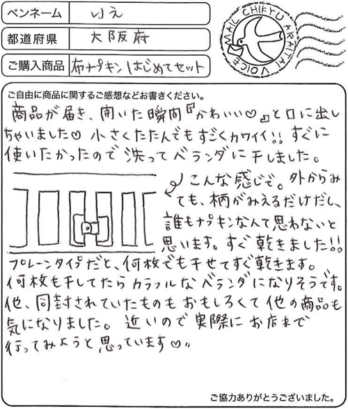 商品が届き、開いた瞬間『かわいい』と口に出しちゃいました。 小さくたたんでもすごくカワイイ!!すぐに使いたかったので 洗ってベランダに干しました。こんな感じで。外からみても、 柄がみえるだけだし、誰もナプキンなんて思わないと 思います。すぐ乾きました!!プレーンタイプだと、何枚でも 干せてすぐ乾きます。何枚も干してたらカラフルなベランダに なりそうです。他、同封されていたものもおもしろくて他の 商品も気になりました。近いので実際にお店まで行って みようと思っています。