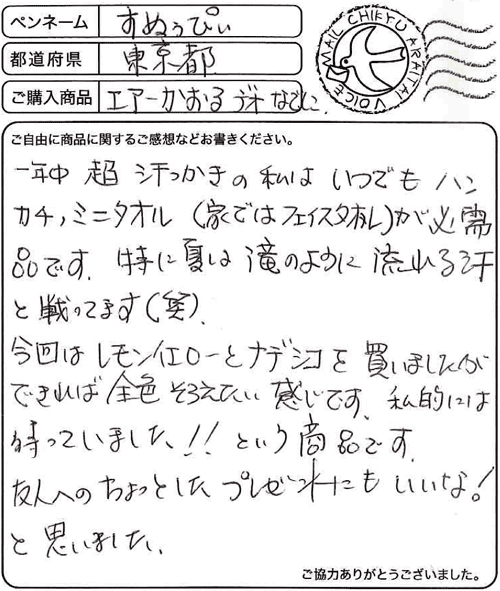 一年中超汗っかきの私はいつでもハンカチ、ミニタオル (家ではフェイスタオル)が必需品です。特に夏は滝のように 流れる汗と戦ってます(笑)今回はレモンイエローとナデシコを 買いましたができれば全色そろえたい感じです。 私的には待っていました!という商品です。友人への ちょっとしたプレゼントにもいいな!と思いました。