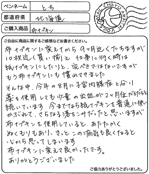 布ナプキンに変えてから9ヶ月近くたちますが10枚近く 買い揃え仕事に行く時は紙ナプキンにしたりと、完ぺきでは ないですがもう布ナプキンにも慣れてきました。そんな中、 今年の8月に子宮内膜症と分り薬を使用しても少量の出血が 2ヶ月位だらだらと続いています。今までなら紙ナプキンを 普通に使いかぶれて、さらなる落ちこみだったと思いますが 布ナプキンを使用していると、あたたかくぬくもりもあり、 きっとこの病気も良くなると心から思ってしまいます 布ナプキンに変えて良かったです。ありがとうございました